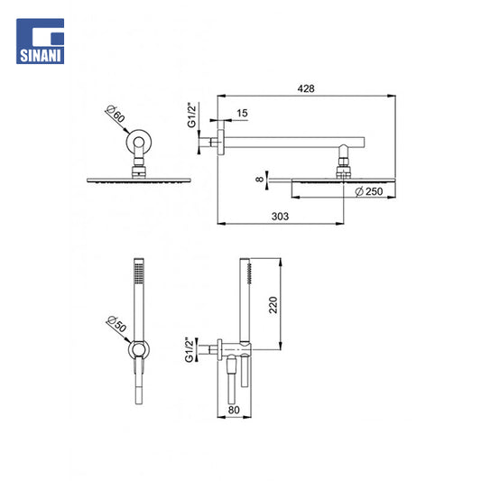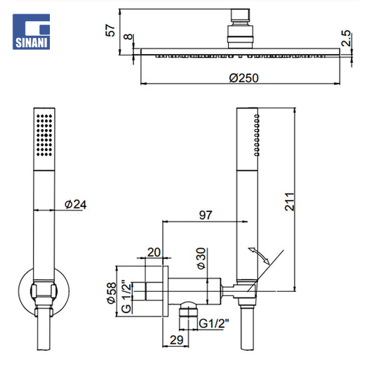 Komplet, koke dushi Ø250 me krah, mbajtese, zorre dhe koke P4
