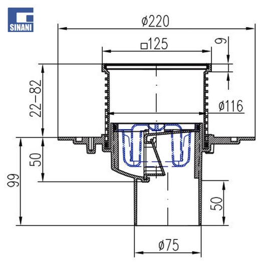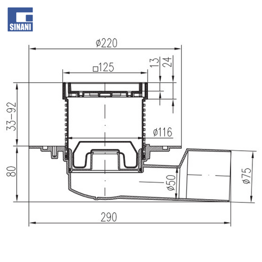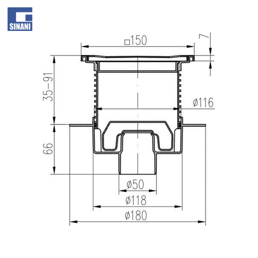Piletë dyshemeje universale Neptun horizontale Ø50/75 me grilë Face dhe fllanxhë inoksi e zezë