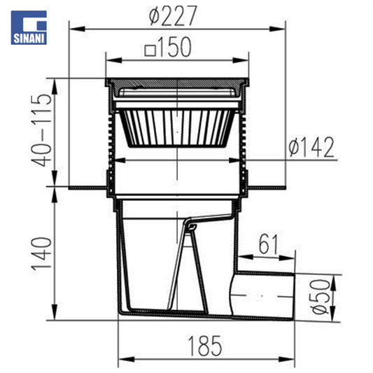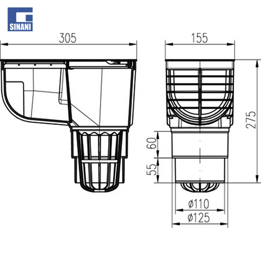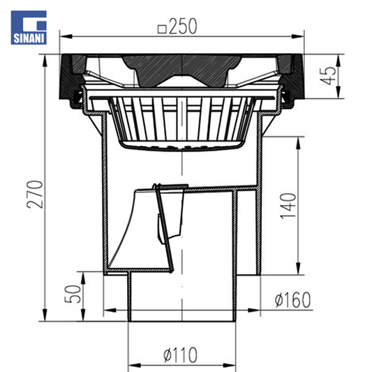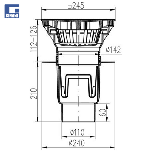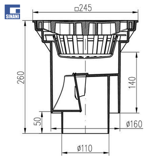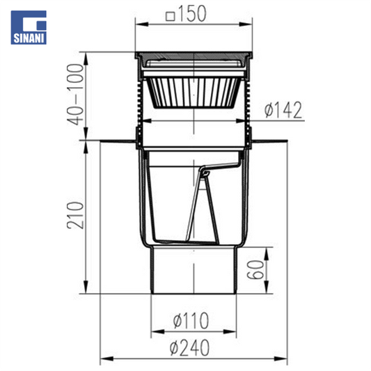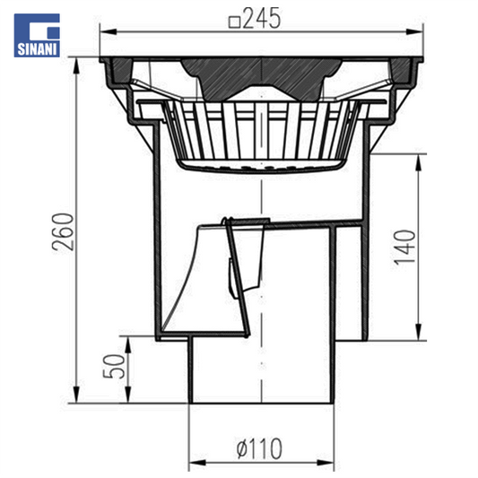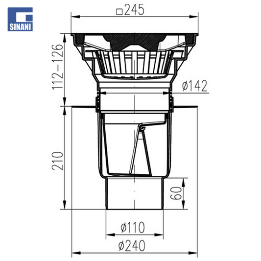 Piletë rruge Ø110 vertikale me grilë gize 250x250, me fllanxhë dhe klapet