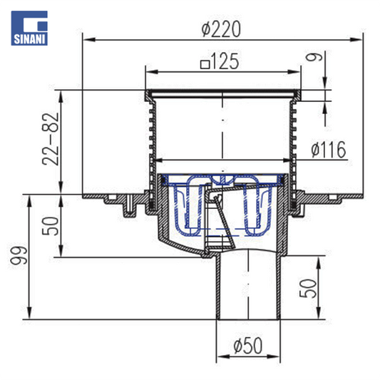 Piletë dyshemeje vertikale universale Ø50 me grilë inoksi Sun