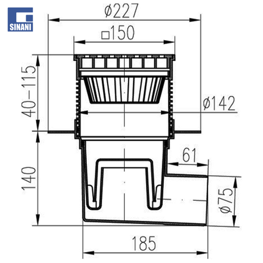 Piletë dyshemeje 150x150 mm horizontale Ø40 me kornizë dhe grilë inoksi Steel