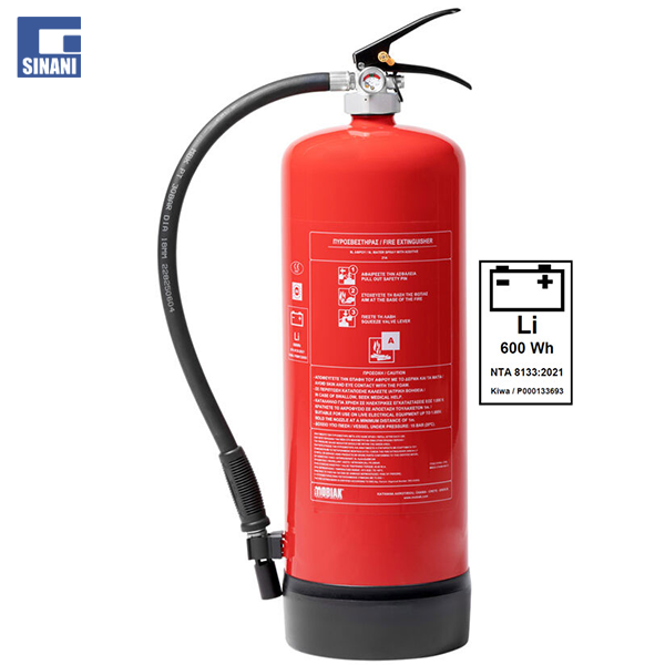 Fikëse zjarri 9 litra Hydrogel, me veshje të brendshme plastike me fileto të bombolës nga ana e jashtme, me valvul sigurie për mbipresion dhe manometër. E përshtatshme për përdorim në zjarret e baterive litium-jon. Mbështetëse metalike e përfshirë