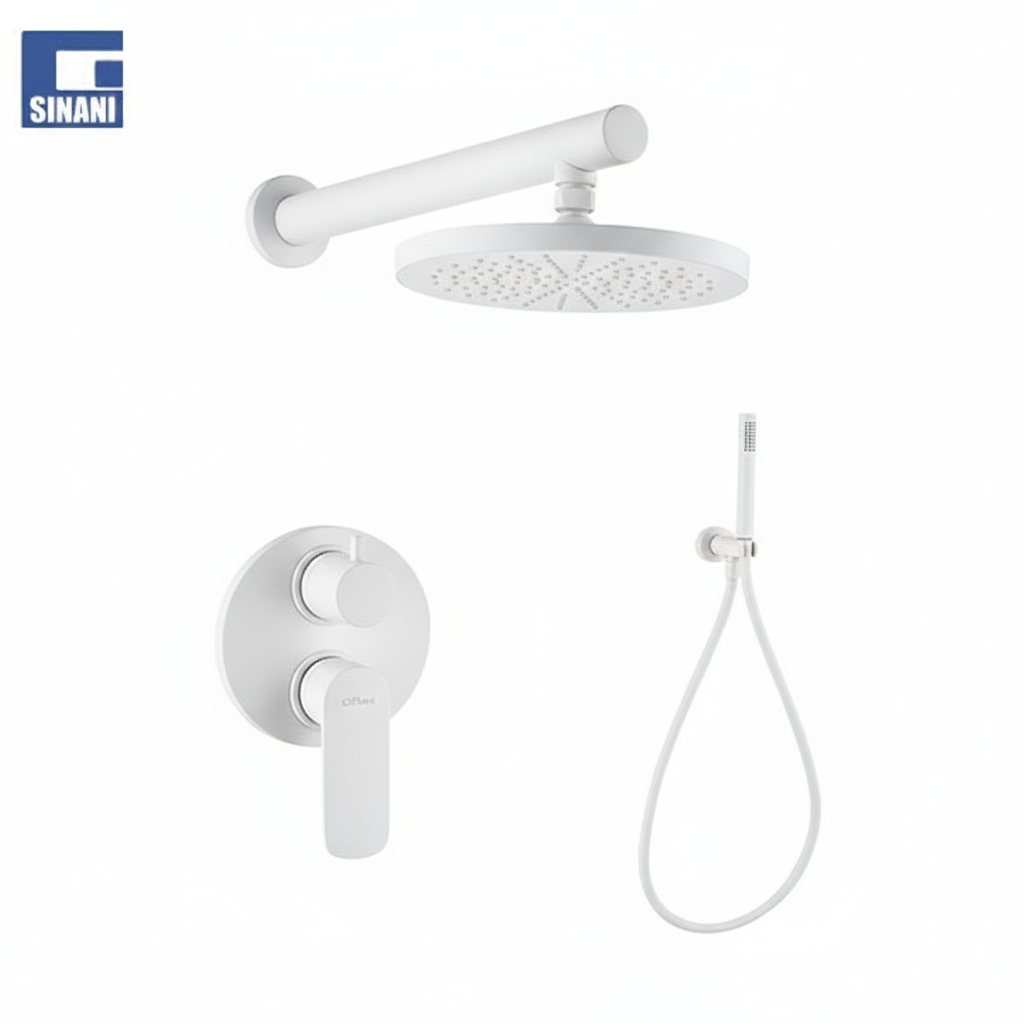 Ky komplet dushi ka linja të buta, dizajni është i thjeshtë dhe elegant dhe përbëhet nga një mikser dushi i integruar, dush dore dupleks dhe koka dushi Ø 250 mm me një formë të rrumbullakosur dhe moderne.