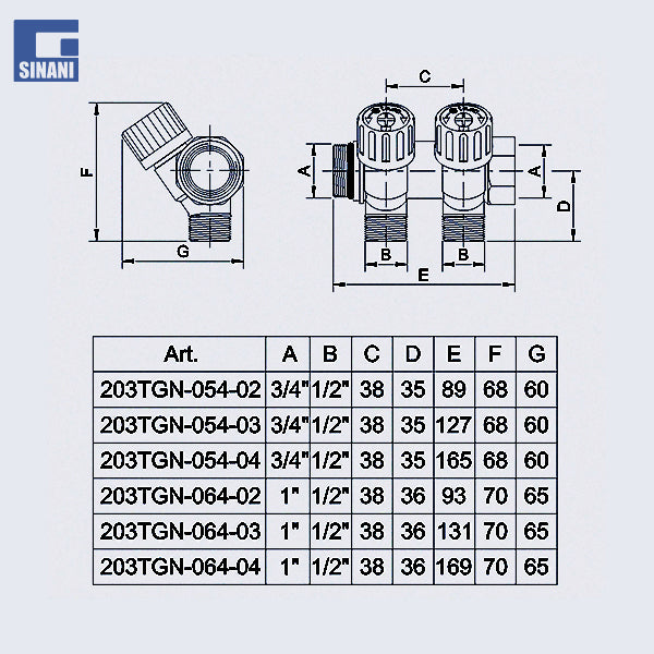 Kolektor modular me kënd 35° M/F me vulë O-Ring, valvola interceptimi me pllaka alumini për të identifikuar zonat e furnizuara, lidhje 1/2”M. Lidhjet në distancë qendrore 38 mm.