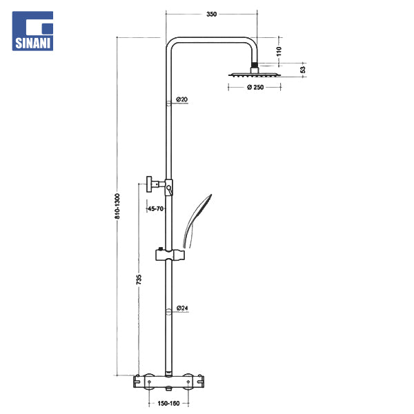 Kollonë dushi e rrethore e zgjatueshme për montim në mur, seria Fusion, me mbështetëse muri me përfundim të zi me mbajtëse muri prej bronzi të fiksuar dhe mbajtëse rrëshqitëse ABS, lidhje ½" F. E kompletuar me mikser dushi të rrumbullakët të jashtëm, seria Alfa-Mix me fishek devijues dhe dalje të dyfishtë ½", kokë dushi e rrethore, seria Warrior-R anti gëlqere me spërkatje fikse, dush rrethor dore i serisë Magnus Ø 100 mm ABS kundër gëlqeres me 3 spërkatës: shiu, masazhi dhe shiu + masazhi, dhe zorrë dushi e serisë Moro me lidhje konike ½" x ½" F.