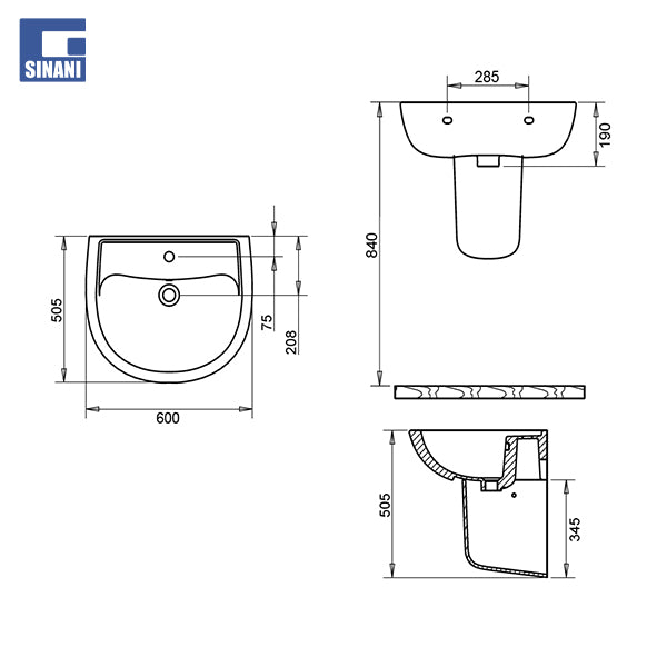 - Përmasat e lavamanit me gjyskollonë - 600 x 505 x H505 mm