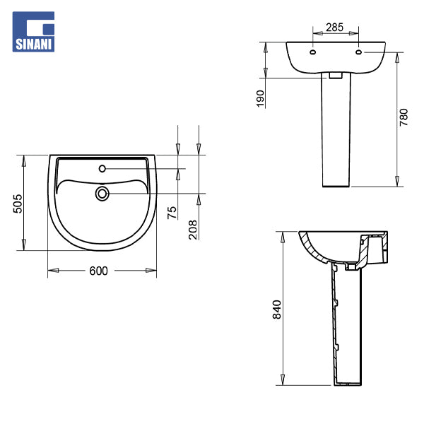 - Përmasat e lavamanit me kollonë - 600 x 505 x H840 mm