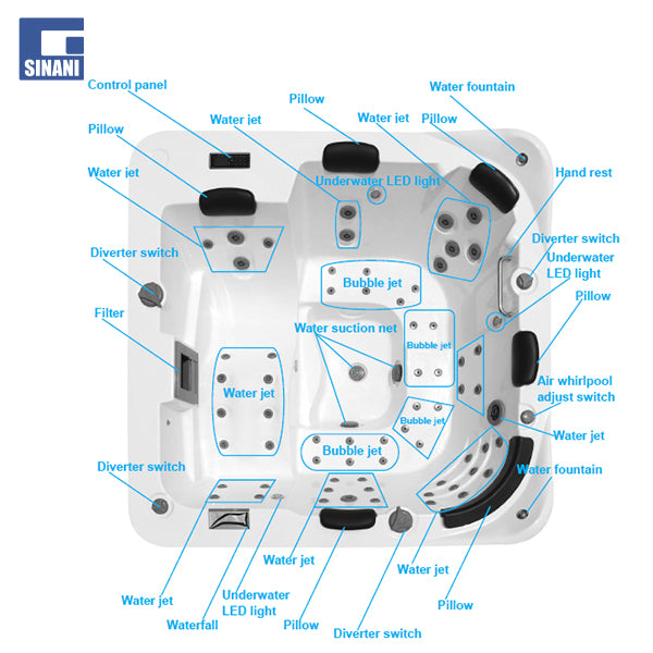 Sistemi i masazhit të ujit funksionon në mënyrë që pompa e ujit të krijojë presion dhe të rrjedhë ujin përmes grykave të masazhit. Mijëra flluska ajri me shpejtësi të lartë uji masazhojnë intensivisht trupin e njeriut. Duke rregulluar rrjedhën e ajrit në grykën e masazhit, ne rregullojmë fuqinë e rrymës së masazhit.