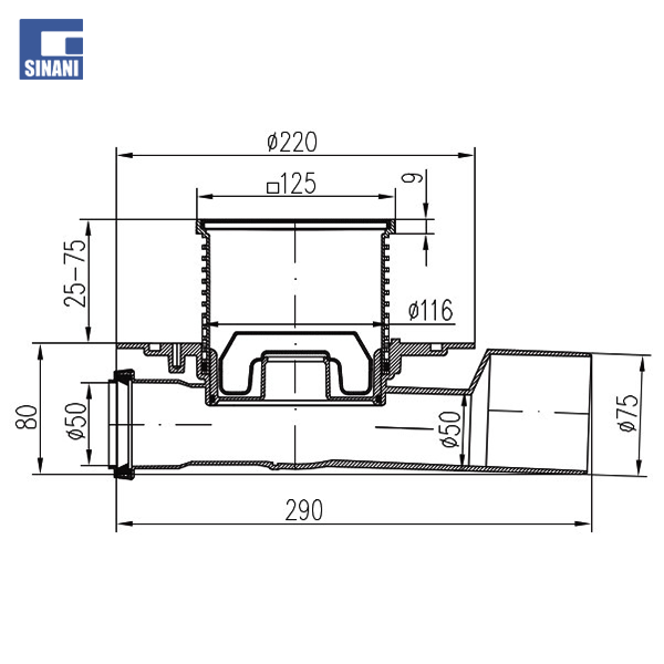 - Diametri i lidhjes së mbetjeve - Ø75 mm