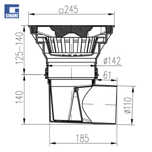 Bërë nga PP dhe PS me stabilizim UV dhe gize gri DIN 1691. Ngarkesa sipas EN 124-B 125 (12,500 kg) dhe rrjetë plastike e bërë nga PP sipas EN 1253 L15 (1,500 kg), me rezistencë deri në 90°C, për maksimumin NEPTxUN. 70°C.