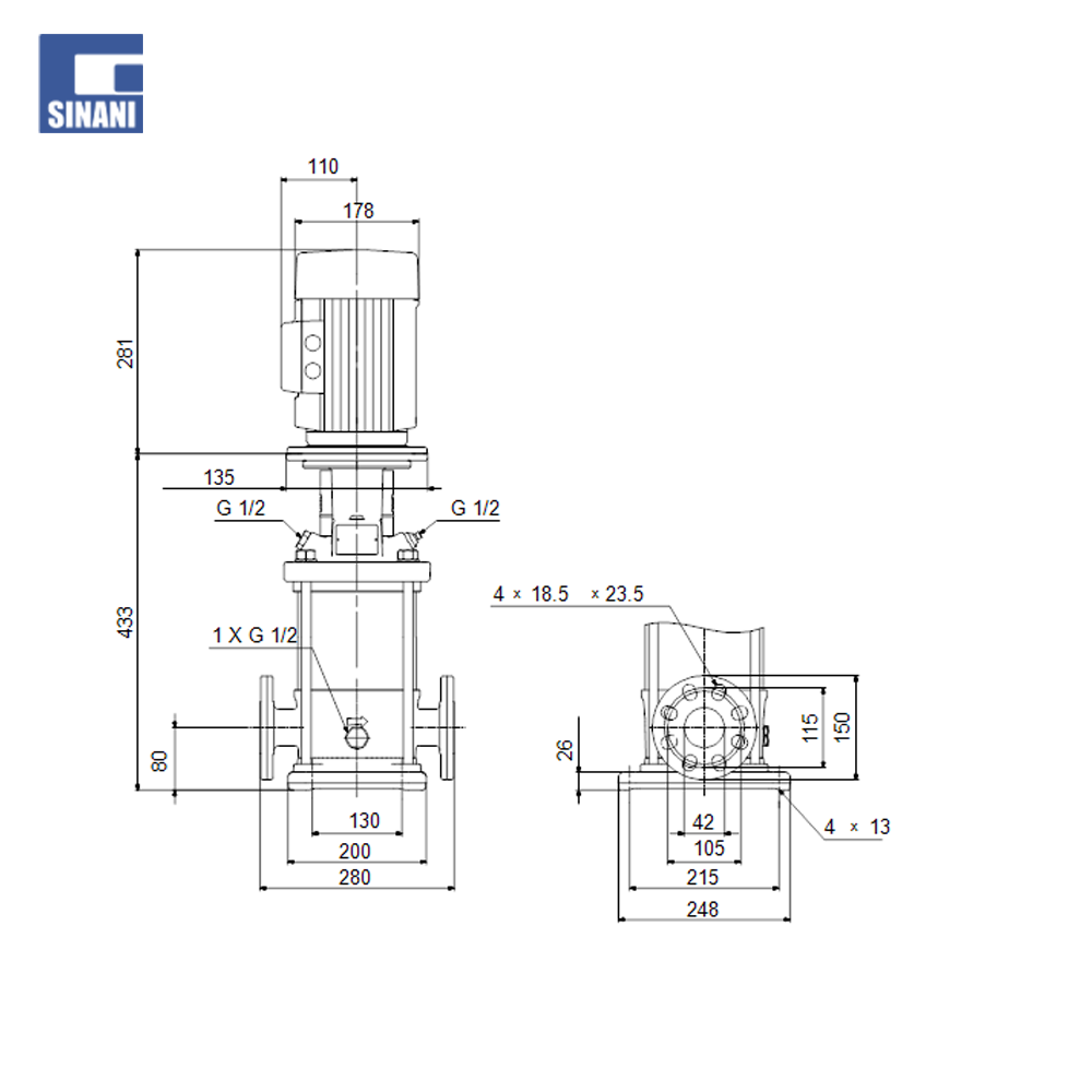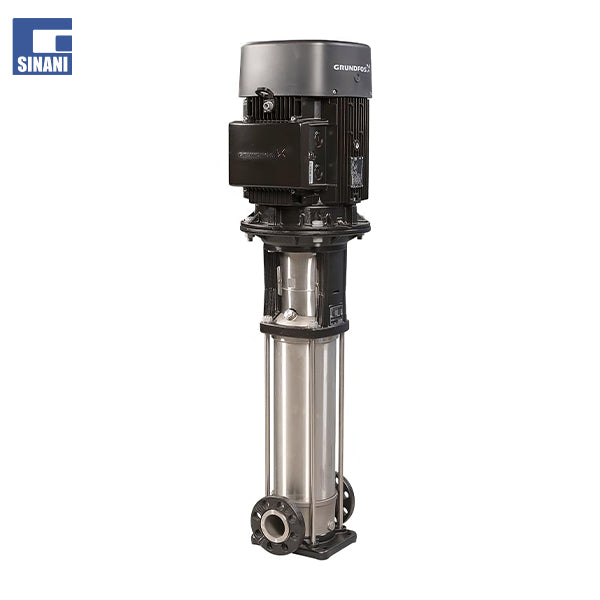 Pompë centrifugale vertikale me shumë shkallë, me porte thithjeje dhe shkarkimi në të njëjtin nivel. Materialet e pompës në kontakt me lëngun janë prej çeliku inox (EN 1.4301)