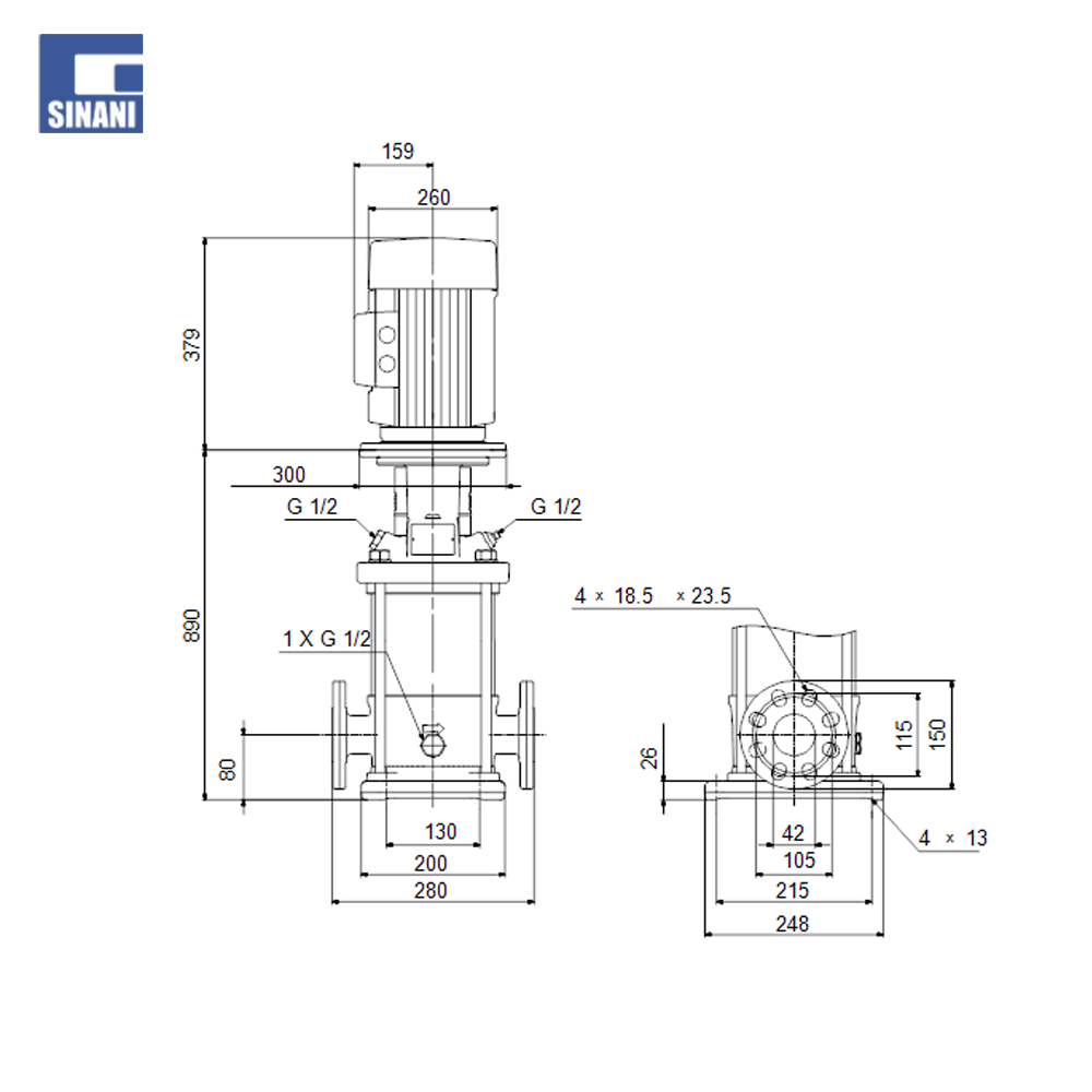 Pompë centrifugale vertikale me shumë shkallë, me porte thithjeje dhe shkarkimi në të njëjtin nivel. Materialet e pompës në kontakt me lëngun janë prej çeliku inox të cilësisë së lartë.