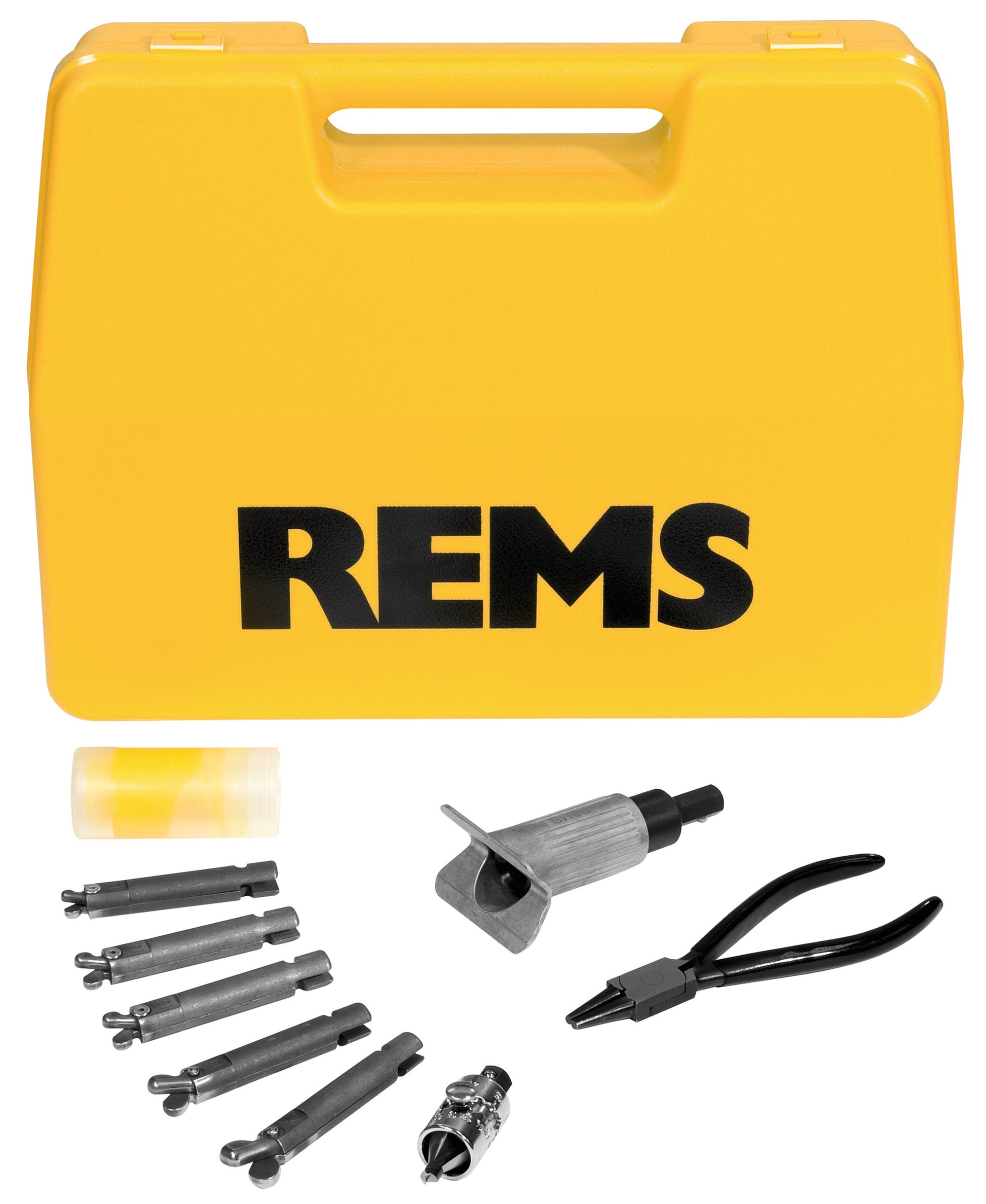 Set Rems Hurricane. Mjet elektrik për prerjen e tubave për tuba bakri të fortë dhe të butë, me diametër 10-22 mm, diametër 3/8"-7/8". Njësi transmisioni me transmision gjashtëkëndor, kuti ingranazhesh pa mirëmbajtje, motor universal 230 V, 50-60 Hz, 630 W, çift rrotullues ekstra i lartë për rrotullim përpara dhe prapa në shpejtësi të ulëta, çelës sigurie. Kontroll elektronik i shpejtësisë pafundësisht i ndryshueshëm nga 0 në 1000 rpm. Mbajtëse mjeti, kokë shpimi, kapëse, lubrifikant. Mjete prerjeje të disponueshme për tuba me dimensione mm ose inç.