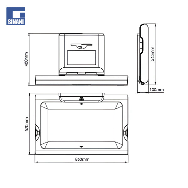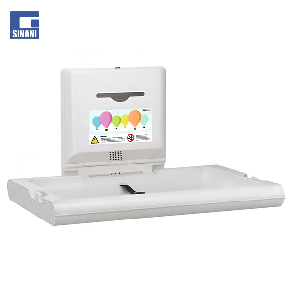 Stacion ndërrimi i bebeve i montuar në mur horizontal i bërë nga polipropileni i bardhë me një aditiv antibakterial të integruar dhe një jonizues që largon mikroorganizmat si viruset, bakteret, kërpudhat etj.