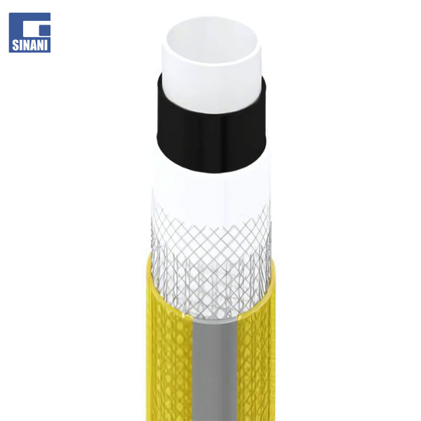 6 shtresa me brendësi të bardhë, shtresë e zezë kundër algave, shtresë e bardhë ndërmjetëse, përforcim tekstili dyfish ATS, mbulesë e jashtme e verdhë transparente me shirit gri të prodhuar me një formulim special anti UV që ngadalëson plakjen e zorrës.