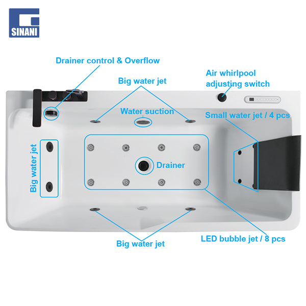 Sistemi i masazhit të ujit funksionon në mënyrë që pompa e ujit të krijojë presion dhe të rrjedhë ujin përmes grykave të masazhit. Mijëra flluska ajri me shpejtësi të lartë uji masazhojnë intensivisht trupin e njeriut. Duke rregulluar rrjedhën e ajrit në grykën e masazhit, ne rregullojmë fuqinë e rrymës së masazhit.