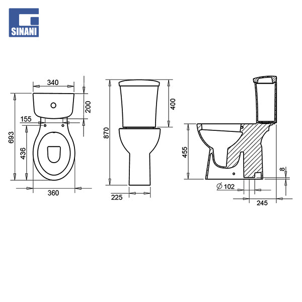 - Përmasat e wc-së me kasetë - 693 x 360 x H870 mm